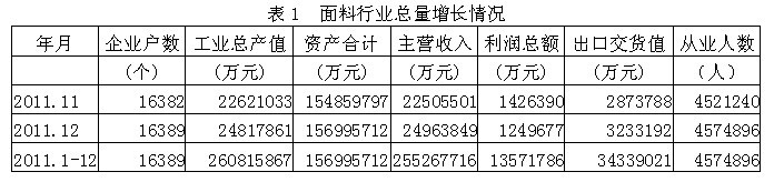 據(jù)國家統(tǒng)計局公布的數(shù)據(jù),2011年1-12月份我國規(guī)模以上面料行業(yè)企業(yè)數(shù)量為16389家,該行業(yè)實現(xiàn)工業(yè)總產(chǎn)值26082億元,同比增加26.10%;資產(chǎn)合計15700億元,同比增加15.46%;實現(xiàn)主營收入25527億元,同比增加25.86%;完成利潤總額1357.18億元,比上年同期增加283.15億元,同比增加26.36%;完成出口交貨值3433.90億元,同比增加11.27%;行業(yè)整體從業(yè)人數(shù)457.49萬人,同比增加5.16%。由此可見,面料行業(yè)總量增長勢頭良好,并為我國經(jīng)濟(jì)、財政、出口和就業(yè)作出了重大的貢獻(xiàn)。