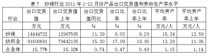 從行業(yè)產(chǎn)品出口交貨值和勞動(dòng)生產(chǎn)率水平看,2011年1-12月份紗線行業(yè)產(chǎn)品出口交貨值為1444.47億元,占紡織全行業(yè)的15.77%;出口交貨值比上年同期增加11.39%;該行業(yè)產(chǎn)品出口比率(出口交貨值/工業(yè)銷售產(chǎn)值)為8.03%,而上年同期為9.29%,表明該行業(yè)產(chǎn)品出口狀況較好;從勞動(dòng)生產(chǎn)率的水平看,2011年1-12月份紗線行業(yè)平均勞產(chǎn)率(工業(yè)增加值/從業(yè)人數(shù))為15.24萬元/人,而上年同期為12.59萬元/人,表明該行業(yè)勞動(dòng)生產(chǎn)率的實(shí)際水平比較理想。