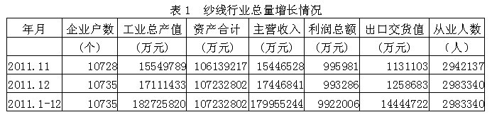據(jù)國家統(tǒng)計(jì)局公布的數(shù)據(jù),2011年1-12月份我國規(guī)模以上紗線行業(yè)企業(yè)數(shù)量為10735家,該行業(yè)實(shí)現(xiàn)工業(yè)總產(chǎn)值18273億元,同比增加29.04%;資產(chǎn)合計(jì)10723億元,同比增加17.11%;實(shí)現(xiàn)主營收入17996億元,同比增加28.46%;完成利潤總額992.20億元,比上年同期增加230.07億元,同比增加30.19%;完成出口交貨值1444.47億元,同比增加11.39%;行業(yè)整體從業(yè)人數(shù)298.33萬人,同比增加6.55%。由此可見,紗線行業(yè)總量增長勢頭良好,并為我國經(jīng)濟(jì)、財(cái)政、出口和就業(yè)作出了重大的貢獻(xiàn)。