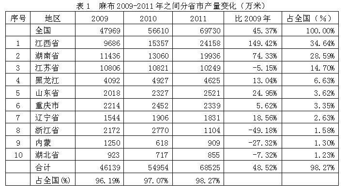全國麻布總產(chǎn)量從2009年47969萬米改變至2011年69730萬米,增加45.37%;其中名列前茅的江西省從9686萬米改變至24158萬米,增加149.42%;湖南省從11436萬米改變至19936萬米,增加74.33%;江蘇省從10806萬米改變至10249萬米,減少5.15%;黑龍江從4092萬米改變至4625萬米,增加13.04%;山東省從2018萬米改變至2521萬米,增加24.95%;重慶市從2214萬米改變至2339萬米,增加5.62%;遼寧省從1544萬米改變至1831萬米,增加18.56%;浙江省從2172萬米改變至1104萬米,減少49.18%;內(nèi)蒙從1250萬米改變至909萬米,減少27.32%;湖北省從923萬米改變至855萬米,減少7.32%;上述10大省市產(chǎn)量合計從46139萬米改變至68525萬米,增加48.52%,占全國總產(chǎn)量的比例從2009年的96.19%改變至2011年的98.27%。由此可見,全國主要省市麻布產(chǎn)量近幾年發(fā)展狀況較好。