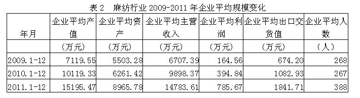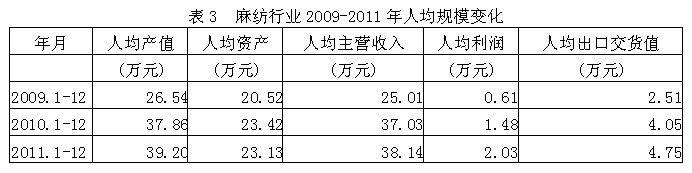 從企業(yè)平均規(guī)模的變化情況看,麻紡行業(yè)企業(yè)平均產(chǎn)值從2009年的7120萬元改變至2011年的15195萬元,增加113.43%;企業(yè)平均資產(chǎn)從5503萬元改變至8966萬元,增加62.92%;企業(yè)平均主營收入從6707萬元改變至14784萬元,增加120.41%;企業(yè)平均利潤從164.56萬元改變至785.67萬元,增加377.42%;企業(yè)平均出口交貨值從674萬元改變至1842萬元,增加173.17%;企業(yè)平均人數(shù)從268人改變至388人,增加44.52%。由此可見,麻紡行業(yè)在近幾年的結構調整過程中,企業(yè)平均規(guī)模有所變化,行業(yè)的發(fā)展勢頭較為健康。