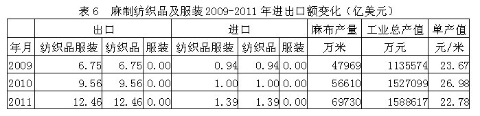 我國麻制紡織品服裝出口額從2009年6.75億美元改變至2011年12.46億美元,增加84.74%;其中紡織品出口額從6.75億美元改變至12.46億美元,增加84.74%;在進口方面,麻制紡織品服裝進口額從0.94億美元改變?yōu)?.39億美元,增加47.70%;其中紡織品進口額從0.94億美元改變?yōu)?.39億美元,增加47.70%;顯示麻制紡織品服裝出口遠高于進口,順差明顯,表明我國麻制紡織品服裝在國際市場上競爭力較強。