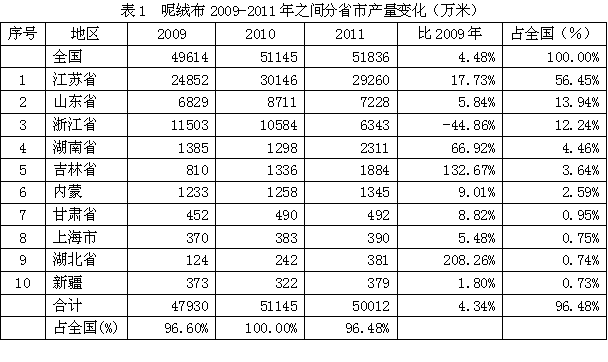 全國(guó)呢絨布總產(chǎn)量從2009年49614萬米改變至2011年51836萬米,增加4.48%;其中名列前茅的江蘇省從24852萬米改變至29260萬米,增加17.73%;山東省從6829萬米改變至7228萬米,增加5.84%;浙江省從11503萬米改變至6343萬米,減少44.86%;湖南省從1385萬米改變至2311萬米,增加66.92%;吉林省從810萬米改變至1884萬米,增加132.67%;內(nèi)蒙從1233萬米改變至1345萬米,增加9.01%;甘肅省從452萬米改變至492萬米,增加8.82%;上海市從370萬米改變至390萬米,增加5.48%;湖北省從124萬米改變至381萬米,增加208.26%;新疆從373萬米改變至379萬米,增加1.80%;上述10大省市產(chǎn)量合計(jì)從47930萬米改變至50012萬米,增加4.34%,占全國(guó)總產(chǎn)量的比例從2009年的96.60%改變至2011年的96.48%。由此可見,全國(guó)主要省市呢絨布產(chǎn)量近幾年發(fā)展?fàn)顩r較好。