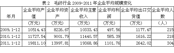 從企業(yè)平均規(guī)模的變化情況看,毛紡行業(yè)企業(yè)平均產(chǎn)值從2009年的10514萬元改變至2011年的19811萬元,增加88.42%;企業(yè)平均資產(chǎn)從8227萬元改變至13998萬元,增加70.15%;企業(yè)平均主營(yíng)收入從10333萬元改變至19369萬元,增加87.44%;企業(yè)平均利潤(rùn)從497.56萬元改變至1101.76萬元,增加121.43%;企業(yè)平均出口交貨值從1177萬元改變至2642萬元,增加124.38%;企業(yè)平均人數(shù)從215人改變至304人,增加41.40%。由此可見,毛紡行業(yè)在近幾年的結(jié)構(gòu)調(diào)整過程中,企業(yè)平均規(guī)模有所變化,行業(yè)的發(fā)展勢(shì)頭較為健康。