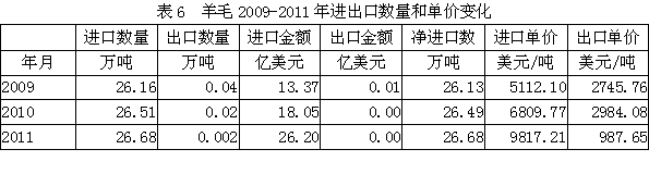 從進(jìn)出口變化情況看,羊毛纖維進(jìn)口數(shù)量從2009年的26.16萬噸改變至2011年的26.68萬噸,增加2.00%;出口數(shù)量從0.04萬噸改變至0.002萬噸,減少93.14%;凈進(jìn)口數(shù)量從26.13萬噸改變至26.68萬噸,增加2.13%;進(jìn)口單價(jià)從5112.1美元/噸改變至9817.2美元/噸,增加92.04%;出口單價(jià)從2745.8美元/噸改變至987.7美元/噸,減少64.03%。由此可見,羊毛纖維進(jìn)口遠(yuǎn)超過出口,顯示國(guó)內(nèi)市場(chǎng)需求較為旺盛。
