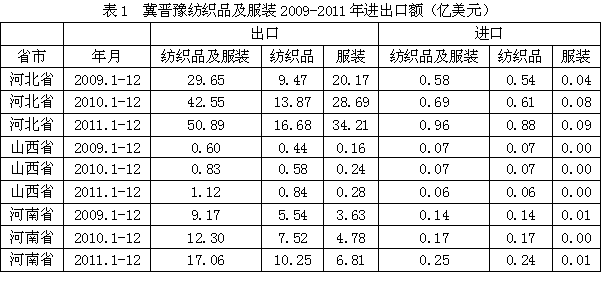 我國河北紡織品及服裝出口額從2009年29.65億美元改變至2011年50.89億美元,增加71.66%;其中紡織品出口額從9.47億美元改變至16.68億美元,增加76.11%;服裝出口額從20.17億美元改變至34.21億美元,增加69.57%;在進口方面,河北紡織品及服裝進口額從0.58億美元改變至0.96億美元,增加65.87%;其中紡織品進口額從0.54億美元改變至0.88億美元,增加62.57%;服裝進口額從0.04億美元改變至0.09億美元,增加109.23%。此外,山西、河南紡織品及服裝進出口額均有所變化,由此可見,冀晉豫地區(qū)紡織品服裝出口高于進口,順差明顯,表明該地區(qū)紡織品服裝在國際市場上競爭力較強。
