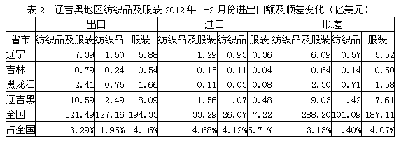 我國遼吉黑三省2012年1-2月份紡織品及服裝出口額為10.59億美元,占全國紡織品服裝出口總額的3.29%,其中紡織品出口額為2.49億美元,占全國1.96%,服裝出口額為8.09億美元,占全國4.16%;在進(jìn)口方面,遼吉黑三省紡織品及服裝進(jìn)口額為1.56億美元,占全國紡織品服裝進(jìn)口總額的4.68%,其中紡織品進(jìn)口額為1.07億美元,占全國4.12%,服裝進(jìn)口額為0.48億美元,占全國6.71%;顯示我國遼吉黑地區(qū)紡織品服裝出口總額遠(yuǎn)高于進(jìn)口總額,順差明顯,表明該地區(qū)紡織品服裝在國際市場上競爭力較強。