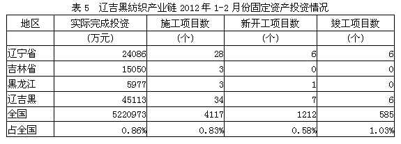 據(jù)國家統(tǒng)計局公布的數(shù)據(jù),2012年1-2月份遼吉黑地區(qū)紡織產(chǎn)業(yè)鏈實際完成投資額4.51億元,占全國實際投資總額的0.86%;當(dāng)年以來到目前為止施工項目總數(shù)為34個,占全國施工總數(shù)的0.83%;其中新開工項目數(shù)7個,占全國新開工項目總數(shù)的0.58%;截至2月底為止,已實現(xiàn)竣工項目數(shù)6個,占全國已竣工項目總數(shù)的1.03%,占該地區(qū)施工項目總數(shù)的17.65%,表明該地區(qū)投資項目進(jìn)展較好。