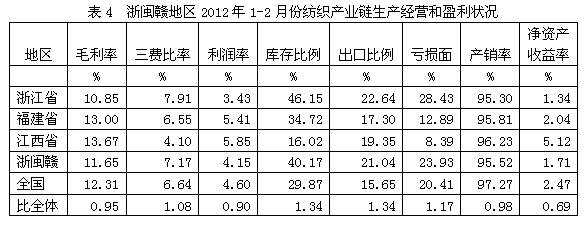 從生產(chǎn)經(jīng)營和盈利狀況看,浙閩贛紡織產(chǎn)業(yè)鏈毛利率2012年1-2月份為11.65%,為全國平均數(shù)的0.95倍,三費比率(營業(yè)、管理和財務(wù)費用率之和)為7.17%,為全國平均數(shù)的1.08倍,利潤率為4.15%,為全國平均數(shù)的0.90倍;庫存比率為40.17%,為全國平均數(shù)的1.34倍;出口比例為21.04%,為全國平均數(shù)的1.34倍;企業(yè)虧損面為23.93%,為全國平均數(shù)的1.17倍。由此可見,浙閩贛地區(qū)的盈利狀況接近于全國紡織產(chǎn)業(yè)鏈的平均水平。