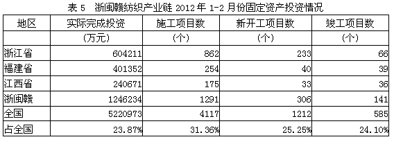 據(jù)國家統(tǒng)計局公布的數(shù)據(jù),2012年1-2月份浙閩贛地區(qū)紡織產(chǎn)業(yè)鏈實際完成投資額124.62億元,占全國實際投資總額的23.87%;當年以來到目前為止施工項目總數(shù)為1291個,占全國施工總數(shù)的31.36%;其中新開工項目數(shù)306個,占全國新開工項目總數(shù)的25.25%;截至2月底為止,已實現(xiàn)竣工項目數(shù)141個,占全國已竣工項目總數(shù)的24.10%,占該地區(qū)施工項目總數(shù)的10.92%,表明該地區(qū)投資項目進展較好。