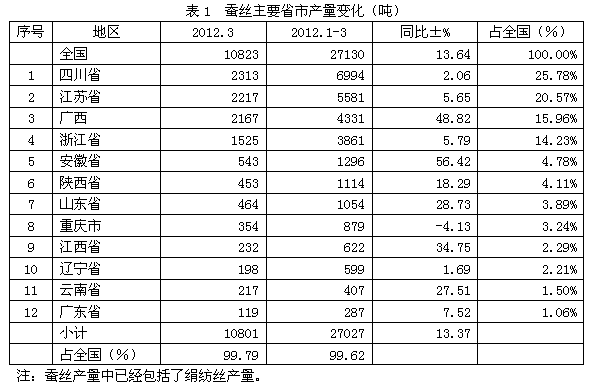 全國(guó)蠶絲2012年1-3月份產(chǎn)量合計(jì)為2.71萬(wàn)噸,比上年同期增加13.64%;其中產(chǎn)量最大的省市是四川省,產(chǎn)量為0.70萬(wàn)噸,為省市龍頭;其次是江蘇省,產(chǎn)量0.56萬(wàn)噸,位居亞軍;然后是廣西,產(chǎn)量0.43萬(wàn)噸,榮立第三;浙江省0.39萬(wàn)噸,為第四;安徽省0.13萬(wàn)噸,占第五;陜西省0.11萬(wàn)噸,位居第六;接下來(lái)是山東省0.11萬(wàn)噸,為第七;重慶市0.09萬(wàn)噸,占第八;江西省0.06萬(wàn)噸,位居第九;遼寧省0.06萬(wàn)噸,為第十名;云南省0.04萬(wàn)噸,居第11名;廣東省0.03萬(wàn)噸,榮立第12名。上述12大省市2012年1-3月份產(chǎn)量合計(jì)為2.70萬(wàn)噸,占全國(guó)2012年1-3月份總產(chǎn)量的99.62%。