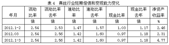 從短期償債和變現(xiàn)能力的變化看,真絲行業(yè)流動(dòng)比率(流動(dòng)資產(chǎn)/流動(dòng)負(fù)債)2012年1-3月份為2.54倍,而上年同期為2.56倍,流動(dòng)比率較高,表明企業(yè)短期償債能力較強(qiáng);