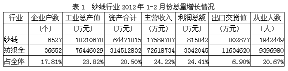 據(jù)國(guó)家統(tǒng)計(jì)局公布的數(shù)據(jù)(按往年慣例,1-2月份的經(jīng)濟(jì)指標(biāo)數(shù)據(jù)合并在一起),2012年1-2月份我國(guó)規(guī)模以上(自2011年起,規(guī)模以上企業(yè)劃分標(biāo)準(zhǔn)調(diào)整為年主營(yíng)業(yè)務(wù)收入2000萬元及以上工業(yè)法人企業(yè))紗線行業(yè)企業(yè)數(shù)量為6527家,占紡織全行業(yè)的17.81%;工業(yè)總產(chǎn)值為1821.07億元,占23.82%;資產(chǎn)合計(jì)為6447.18億元,占20.50%;主營(yíng)收入為1758.97億元,占24.22%;利潤(rùn)總額為81.58億元,占24.41%;出口交貨值為80.29億元,占6.90%;從業(yè)人數(shù)為194.24萬人,占20.67%。由此可見,紗線行業(yè)總產(chǎn)值、總資產(chǎn)、主營(yíng)收入、利潤(rùn)總額、出口和就業(yè)均給紡織全行業(yè)作出了巨大的貢獻(xiàn)。