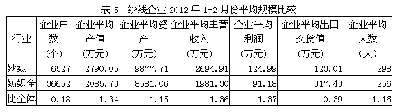從企業(yè)平均規(guī)模的變化情況看,2012年1-2月份紗線企業(yè)平均產(chǎn)值為2790萬元,為紡織全行業(yè)平均數(shù)的1.34倍;企業(yè)平均資產(chǎn)為9878萬元,為行業(yè)平均數(shù)的1.15倍;企業(yè)平均主營(yíng)收入為2695萬元,為行業(yè)平均數(shù)的1.36倍;企業(yè)平均利潤(rùn)為124.99萬元,為行業(yè)平均數(shù)的1.37倍;企業(yè)平均出口交貨值為123.01萬元,為行業(yè)平均數(shù)的0.39倍;企業(yè)平均人數(shù)為298人,為行業(yè)平均數(shù)的1.16倍。由此可見,紗線企業(yè)的平均規(guī)模接近于紡織全行業(yè)的平均水平,反映該行業(yè)大企業(yè)和優(yōu)質(zhì)產(chǎn)能占有一定的水平,行業(yè)的發(fā)展勢(shì)頭比較健康。