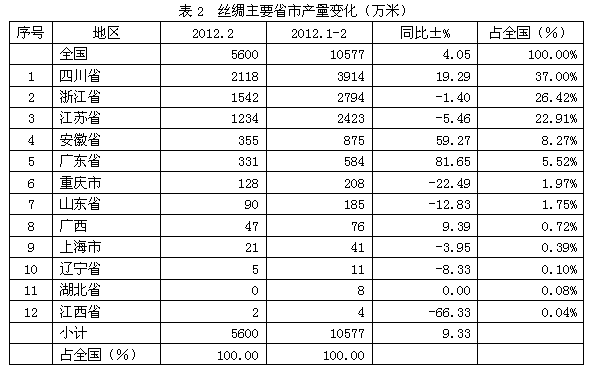 從2012年2月份的情況看,全國絲綢當(dāng)月總產(chǎn)量為0.56億米,上述12大省市的當(dāng)月產(chǎn)量合計(jì)為0.56億米,占全國當(dāng)月總產(chǎn)量的100%;由此可見,我國前12大省市的絲綢產(chǎn)量約占全國總產(chǎn)量的全部。