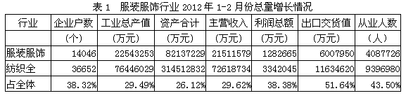 據(jù)國(guó)家統(tǒng)計(jì)局公布的數(shù)據(jù)(按往年慣例,1-2月份的經(jīng)濟(jì)指標(biāo)數(shù)據(jù)合并在一起),2012年1-2月份我國(guó)規(guī)模以上(自2011年起,規(guī)模以上企業(yè)劃分標(biāo)準(zhǔn)調(diào)整為年主營(yíng)業(yè)務(wù)收入2000萬(wàn)元及以上工業(yè)法人企業(yè))服裝服飾行業(yè)企業(yè)數(shù)量為14046家,占紡織全行業(yè)的38.32%;工業(yè)總產(chǎn)值為2254.33億元,占29.49%;資產(chǎn)合計(jì)為8213.72億元,占26.12%;主營(yíng)收入為2151.16億元,占29.62%;利潤(rùn)總額為128.27億元,占38.38%;出口交貨值為600.80億元,占51.64%;從業(yè)人數(shù)為408.77萬(wàn)人,占43.50%。由此可見(jiàn),服裝服飾行業(yè)總產(chǎn)值、總資產(chǎn)、主營(yíng)收入、利潤(rùn)總額、出口和就業(yè)均給紡織全行業(yè)作出了巨大的貢獻(xiàn)。