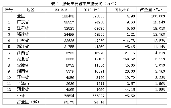 全國(guó)服裝2012年1-2月份產(chǎn)量合計(jì)為37.58億件,比上年同期減少4.93%;其中產(chǎn)量最大的省市是廣東省,產(chǎn)量為7.50億件,為省市龍頭;其次是江蘇省,產(chǎn)量6.77億件,位居亞軍;然后是福建省,產(chǎn)量4.80億件,榮立第三;山東省4.72億件,為第四;浙江省4.19億件,占第五;江西省1.69億件,位居第六;接下來(lái)是湖北省1.21億件,為第七;安徽省1.16億件,占第八;河南省1.04億件,位居第九;遼寧省0.87億件,為第十名;上海市0.74億件,居第11名;河北省0.71億件,榮立第12名。上述12大省市2012年1-2月份產(chǎn)量合計(jì)為35.38億件,占全國(guó)2012年1-2月份總產(chǎn)量的94.14%。