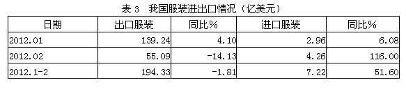 根據(jù)中國(guó)海關(guān)的統(tǒng)計(jì)數(shù)據(jù),我國(guó)2012年1-2月份服裝出口總額194.33億美元,同比減少1.81%,占紡織品及服裝出口總額321.49億美元的60.45%;1-2月份服裝進(jìn)口總額7.22億美元,同比增加51.60%,占紡織品及服裝進(jìn)口總額33.29億美元的21.69%;顯示中國(guó)服裝外貿(mào)形勢(shì)較好。