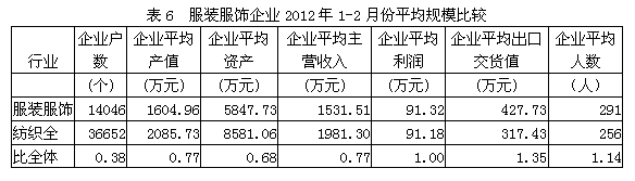 從企業(yè)平均規(guī)模的變化情況看,2012年1-2月份服裝服飾企業(yè)平均產(chǎn)值為1605萬(wàn)元,為紡織全行業(yè)平均數(shù)的0.77倍;企業(yè)平均資產(chǎn)為5848萬(wàn)元,為行業(yè)平均數(shù)的0.68倍;企業(yè)平均主營(yíng)收入為1532萬(wàn)元,為行業(yè)平均數(shù)的0.77倍;企業(yè)平均利潤(rùn)為91.32萬(wàn)元,為行業(yè)平均數(shù)的1.00倍;企業(yè)平均出口交貨值為427.73萬(wàn)元,為行業(yè)平均數(shù)的1.35倍;企業(yè)平均人數(shù)為291人,為行業(yè)平均數(shù)的1.14倍。由此可見(jiàn),服裝服飾企業(yè)的平均規(guī)模接近于紡織全行業(yè)的平均水平,反映該行業(yè)大企業(yè)和優(yōu)質(zhì)產(chǎn)能占有一定的水平,行業(yè)的發(fā)展勢(shì)頭比較健康。