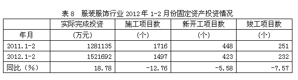 據(jù)國(guó)家統(tǒng)計(jì)局公布的數(shù)據(jù),2012年1-2月份服裝鞋帽行業(yè)實(shí)際完成投資額152.17億元,同比增加18.78%;當(dāng)年以來(lái)到目前為止施工項(xiàng)目總數(shù)為1497個(gè),同比減少12.76%;其中新開(kāi)工項(xiàng)目數(shù)423個(gè),同比減少5.58%;截至2月底為止,已實(shí)現(xiàn)竣工項(xiàng)目數(shù)232個(gè),同比減少7.57%,占施工項(xiàng)目總數(shù)的15.50%,表明該行業(yè)投資項(xiàng)目進(jìn)展較好。