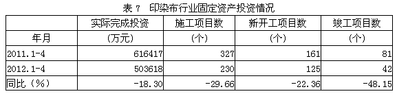 據(jù)國家統(tǒng)計局公布的數(shù)據(jù),2012年1-4月份印染布行業(yè)實際完成投資額50.36億元,同比減少18.30%;當(dāng)年以來到目前為止施工項目總數(shù)為230個,同比減少29.66%;其中新開工項目數(shù)125個,同比減少22.36%;截至4月底為止,已實現(xiàn)竣工項目數(shù)42個,同比減少48.15%,占施工項目總數(shù)的18.26%,表明該行業(yè)投資項目進展較好。
