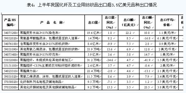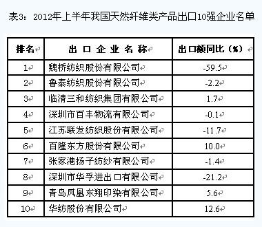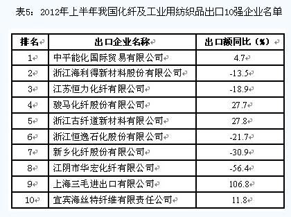 從出口企業(yè)的情況來看,我國化纖及工業(yè)用紡織品出口集中度較低,出口額排名前10位企業(yè)的出口額合計(jì)僅占同期出口總額的4.4%。(今年上半年出口10強(qiáng)企業(yè)名單見表5)