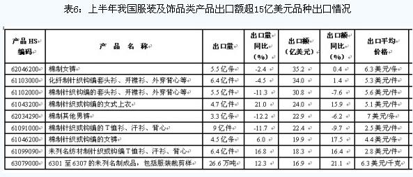 出口額低位回穩(wěn),對歐回落,對美日小幅增長 今年上半年,我國服裝及飾品類產(chǎn)品出口額為814.9億美元,同比小幅增長2.6%,呈低位回穩(wěn)態(tài)勢。其中,由于歐債危機(jī),歐洲市場始終萎靡不振,導(dǎo)致我國對歐盟服裝及飾品類產(chǎn)品出口顯著回落。今年上半年我國對歐盟出口額為175.9億美元,同比下降13.1%;對歐盟成員國德國和法國的出口分別下降22.2%和14.9%。對美國和日本市場分別出口145.6億美元和109億美元,同比分別增長5.2%和3.4%。對歐盟、美國和日本三大市場的出口額合計(jì)占同期我國服裝及飾品類產(chǎn)品出口總額的52.8%。 從出口品種來看,主要以棉質(zhì)類服裝為主。今年上半年出口額超15億美元的品種共有9種,出口額合計(jì)占同期我國服裝及飾品出口總額的27.5%(具體情況詳見表6)。