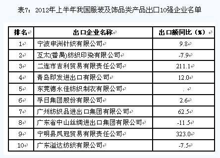 從出口企業(yè)情況來看,我國服裝及飾品類產(chǎn)品出口集中度與紡織原料類產(chǎn)品相比更為分散,出口額排名前10位企業(yè)的出口額合計(jì)僅占同期出口總額的3.3%。(今年上半年出口10強(qiáng)企業(yè)名單見表7)
