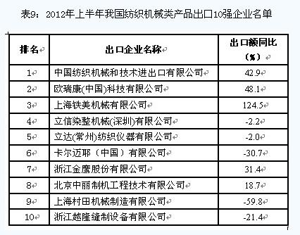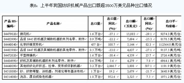 紡織機(jī)械產(chǎn)品 出口額小幅增長,對印尼出口大增 今年上半年,我國紡織機(jī)械產(chǎn)品共出口10.9億美元,同比增長3.3%。其中,對印度和歐盟市場分別出口2億美元和0.9億美元,同比分別下降19.5%和10.9%;對印尼出口大幅增長,出口額為1.1億美元,同比增長74.8%;對孟加拉國出口0.8億美元,同比增長9.3%。 對以上四大市場的出口額合計(jì)占同期紡織機(jī)械類產(chǎn)品出口總額的44.3%。(出口額超3500萬美元的主要品種出口情況見表8) 從出口企業(yè)情況來看,我國紡織機(jī)械類產(chǎn)品出口集中度相對較高,出口額排名前10位企業(yè)的出口額合計(jì)占同期我國紡織機(jī)械類產(chǎn)品出口總額的23.7%。(今年上半年出口10強(qiáng)企業(yè)名單見表9)