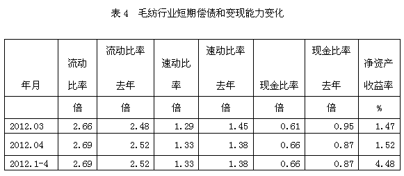 從短期償債和變現(xiàn)能力的變化看,毛紡織行業(yè)流動比率(流動資產(chǎn)/流動負(fù)債)2012年1-4月份為2.69倍,而上年同期為2.52倍,流動比率較高,表明企業(yè)短期償債能力較強(qiáng);