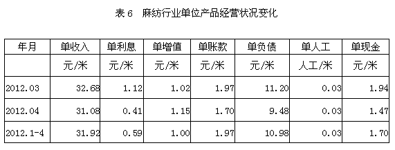 從單位產(chǎn)品經(jīng)營(yíng)狀況變化情況看,2012年1-4月份我國(guó)麻紡織行業(yè)中相對(duì)于每米麻布產(chǎn)量而言,其單收入(單位產(chǎn)品的主營(yíng)收入)為31.92元/米,單利息(單位產(chǎn)品的利息支出)為0.59元/米,單增值(單位產(chǎn)品的增值稅支出)為1.00元/米,單賬款(單位產(chǎn)品的應(yīng)收帳款)為1.97元/米,單負(fù)債(單位產(chǎn)品的負(fù)債)為10.98元/米,單人工(單位產(chǎn)品的人工消耗)為0.03人工/米(表示每人每天生產(chǎn)麻布產(chǎn)量33.25米/人工),單現(xiàn)金(單位產(chǎn)品的現(xiàn)金流)為1.70元/米。