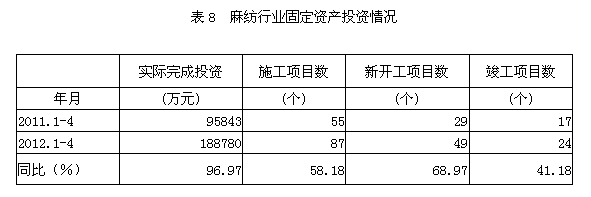 據(jù)國(guó)家統(tǒng)計(jì)局公布的數(shù)據(jù),2012年1-4月份麻紡行業(yè)實(shí)際完成投資額18.88億元,同比增加96.97%;當(dāng)年以來(lái)到目前為止施工項(xiàng)目總數(shù)為87個(gè),同比增加58.18%;其中新開(kāi)工項(xiàng)目數(shù)49個(gè),同比增加68.97%;截至4月底為止,已實(shí)現(xiàn)竣工項(xiàng)目數(shù)24個(gè),同比增加41.18%,占施工項(xiàng)目總數(shù)的27.59%,表明該行業(yè)投資項(xiàng)目進(jìn)展較好。
