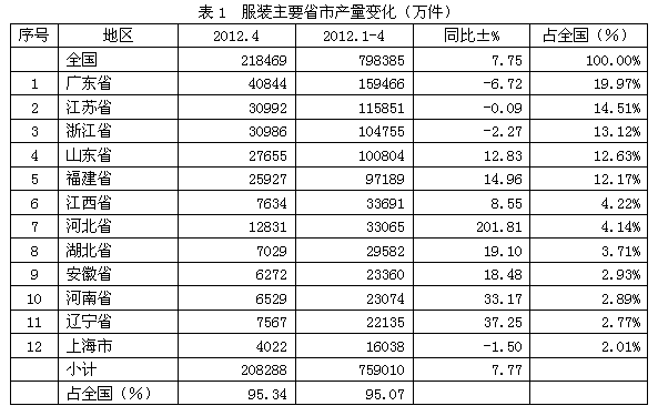 從2012年4月份的情況看,全國服裝當月總產量為21.85億件,上述12大省市的當月產量合計為20.83億件,占全國當月總產量的95.34%;由此可見,我國前12大省市的服裝產量約占全國總產量的絕大部分。
