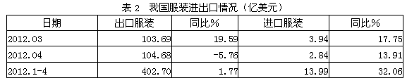 與上月相比,服裝行業(yè)2012年1-4月份進出口均有所變化,外貿形勢較好。