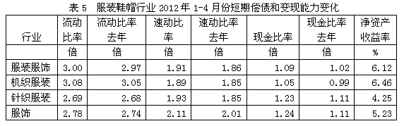 從短期償債和變現(xiàn)能力的變化看,服裝服飾行業(yè)流動比率(流動資產/流動負債)2012年1-4月份為3.00倍,而上年同期為2.97倍,流動比率較高,表明企業(yè)短期償債能力較強;