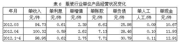 從單位產品經營狀況變化情況看,2012年1-4月份我國機織服裝行業(yè)中相對于每件服裝產量而言,其單收入(單位產品的主營收入)為98.95元/件,單利息(單位產品的利息支出)為0.62元/件,單增值(單位產品的增值稅支出)為2.75元/件,單賬款(單位產品的應收帳款)為7.71元/件,單負債(單位產品的負債)為30.79元/件,單人工(單位產品的人工消耗)為0.11人工/件(表示每人每天生產服裝產量9.50件/人工),單現(xiàn)金(單位產品的現(xiàn)金流)為12.91元/件。