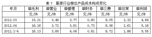 從單位產品成本構成變化情況看,2012年1-4月份我國機織服裝行業(yè)中相對于每件服裝產量而言,其單毛利為16.13元/件,單營業(yè)(單位產品的營業(yè)費用)為3.85元/件,單管理(單位產品的管理費用)為4.06元/件,單財務(單位產品的財務費用)為0.81元/件,單三費為8.72元/件,單非常(單位產品的非經常性損益)為1.86元/件,單利潤(稅前利潤)為5.55元/件,如果剔除非經常性損益的影響,單位產品的名義稅前利潤為7.41元/件。