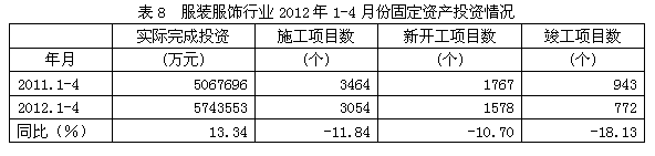 據(jù)國家統(tǒng)計局公布的數(shù)據(jù),2012年1-4月份服裝服飾行業(yè)實際完成投資額574.36億元,同比增加13.34%;當年以來到目前為止施工項目總數(shù)為3054個,同比減少11.84%;其中新開工項目數(shù)1578個,同比減少10.70%;截至4月底為止,已實現(xiàn)竣工項目數(shù)772個,同比減少18.13%,占施工項目總數(shù)的25.28%,表明該行業(yè)投資項目進展較好。