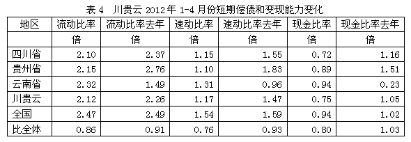 從短期償債和變現(xiàn)能力變化情況看,川貴云地區(qū)流動(dòng)比率(流動(dòng)資產(chǎn)/流動(dòng)負(fù)債)2012年1-4月份為2.12倍,為全國平均數(shù)的0.86倍,流動(dòng)比率較高,表明企業(yè)短期償債能力較強(qiáng);