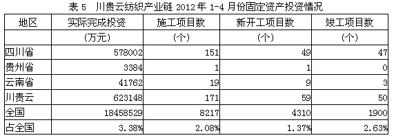 據(jù)國家統(tǒng)計(jì)局公布的數(shù)據(jù),2012年1-4月份川貴云地區(qū)紡織產(chǎn)業(yè)鏈實(shí)際完成投資額62.31億元,占全國實(shí)際投資總額的3.38%;當(dāng)年以來到目前為止施工項(xiàng)目總數(shù)為171個(gè),占全國施工總數(shù)的2.08%;其中新開工項(xiàng)目數(shù)59個(gè),占全國新開工項(xiàng)目總數(shù)的1.37%;截至4月底為止,已實(shí)現(xiàn)竣工項(xiàng)目數(shù)50個(gè),占全國已竣工項(xiàng)目總數(shù)的2.63%,占該地區(qū)施工項(xiàng)目總數(shù)的29.24%,表明該地區(qū)投資項(xiàng)目進(jìn)展較好。