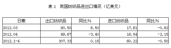 根據(jù)中國(guó)海關(guān)的統(tǒng)計(jì)數(shù)據(jù),我國(guó)2012年1-4月份紡織品出口總額307.33億美元,同比增加0.15%,占紡織品及服裝出口總額710.03億美元的43.28%;1-4月份紡織品進(jìn)口總額60.22億美元,同比減少0.50%,占紡織品及服裝進(jìn)口總額74.21億美元的81.14%;顯示中國(guó)紡織品外貿(mào)形勢(shì)較好。