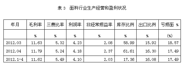 從企業(yè)生產(chǎn)經(jīng)營(yíng)和盈利狀況看,面料行業(yè)毛利率2012年1-4月份為11.62%,三費(fèi)比率(營(yíng)業(yè)、管理和財(cái)務(wù)費(fèi)用率之和)為5.49%,利潤(rùn)率為4.10%,如果剔除非經(jīng)常性損益的影響,名義稅前利潤(rùn)率為6.13%;該行業(yè)庫(kù)存比率為17.36%,表明產(chǎn)品銷售正常;出口比例為16.08%,表明出口狀況較好;該行業(yè)虧損面為17.49%。由此可見(jiàn),在面料行業(yè)中,生產(chǎn)經(jīng)營(yíng)狀況運(yùn)作得較好。