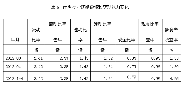 從短期償債和變現(xiàn)能力的變化看,面料行業(yè)流動(dòng)比率(流動(dòng)資產(chǎn)/流動(dòng)負(fù)債)2012年1-4月份為2.42倍,而上年同期為2.38倍,流動(dòng)比率較高,表明企業(yè)短期償債能力較強(qiáng);