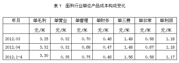 從單位產(chǎn)品成本構(gòu)成變化情況看,2012年1-4月份我國(guó)面料行業(yè)中相對(duì)于每米面料產(chǎn)量而言,其單毛利為3.30元/米,單營(yíng)業(yè)(單位產(chǎn)品的營(yíng)業(yè)費(fèi)用)為0.35元/米,單管理(單位產(chǎn)品的管理費(fèi)用)為0.75元/米,單財(cái)務(wù)(單位產(chǎn)品的財(cái)務(wù)費(fèi)用)為0.46元/米,單三費(fèi)為1.56元/米,單非常(單位產(chǎn)品的非經(jīng)常性損益)為0.58元/米,單利潤(rùn)(稅前利潤(rùn))為1.17元/米,如果剔除非經(jīng)常性損益的影響,單位產(chǎn)品的名義稅前利潤(rùn)為1.74元/米。