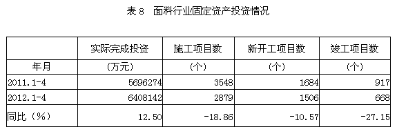 據(jù)國(guó)家統(tǒng)計(jì)局公布的數(shù)據(jù),2012年1-4月份面料行業(yè)實(shí)際完成投資額640.81億元,同比增加12.50%;當(dāng)年以來(lái)到目前為止施工項(xiàng)目總數(shù)為2879個(gè),同比減少18.86%;其中新開(kāi)工項(xiàng)目數(shù)1506個(gè),同比減少10.57%;截至4月底為止,已實(shí)現(xiàn)竣工項(xiàng)目數(shù)668個(gè),同比減少27.15%,占施工項(xiàng)目總數(shù)的23.20%,表明該行業(yè)投資項(xiàng)目進(jìn)展較好。