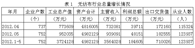 據(jù)國家統(tǒng)計(jì)局公布的數(shù)據(jù),2012年1-5月份我國規(guī)模以上無紡布行業(yè)企業(yè)數(shù)量為752家,該行業(yè)實(shí)現(xiàn)工業(yè)總產(chǎn)值372.41億元,同比增加22.57%;資產(chǎn)合計(jì)498.21億元,同比增加13.55%;實(shí)現(xiàn)主營收入356.40億元,同比增加22.29%;完成利潤總額18.46億元,比上年同期增加3.24億元,同比增加21.25%;完成出口交貨值71.0億元,同比增加13.33%;行業(yè)整體從業(yè)人數(shù)12.39萬人,同比增加7.70%。由此可見,無紡布行業(yè)總量增長勢頭良好,并為我國經(jīng)濟(jì)、財(cái)政、出口和就業(yè)作出了重大的貢獻(xiàn)。