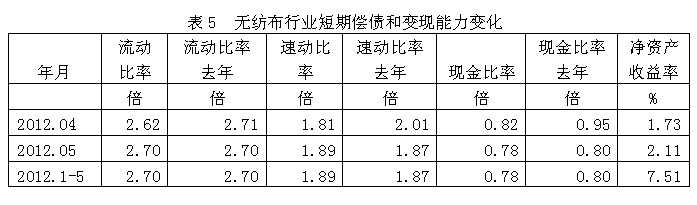 從短期償債和變現(xiàn)能力的變化看,無紡布行業(yè)流動(dòng)比率(流動(dòng)資產(chǎn)/流動(dòng)負(fù)債)2012年1-5月份為2.70倍,而上年同期為2.70倍,流動(dòng)比率較高,表明企業(yè)短期償債能力較強(qiáng);
