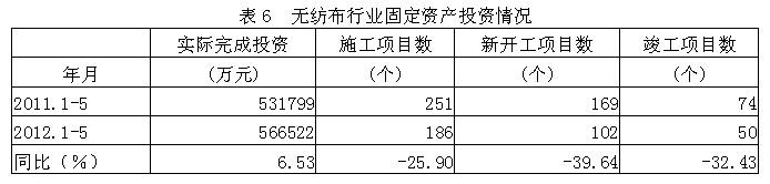 據(jù)國家統(tǒng)計(jì)局公布的數(shù)據(jù),2012年1-5月份無紡布行業(yè)實(shí)際完成投資額56.65億元,同比增加6.53%;當(dāng)年以來到目前為止施工項(xiàng)目總數(shù)為186個(gè),同比減少25.90%;其中新開工項(xiàng)目數(shù)102個(gè),同比減少39.64%;截至5月底為止,已實(shí)現(xiàn)竣工項(xiàng)目數(shù)50個(gè),同比減少32.43%,占施工項(xiàng)目總數(shù)的26.88%,表明該行業(yè)投資項(xiàng)目進(jìn)展較好。