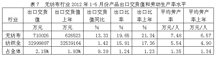 從行業(yè)產(chǎn)品出口交貨值和勞動(dòng)生產(chǎn)率水平看,2012年1-5月份無紡布行業(yè)產(chǎn)品出口交貨值為71.00億元,占紡織全行業(yè)的2.15%;出口交貨值比上年同期增加13.33%;該行業(yè)產(chǎn)品出口比率(出口交貨值/工業(yè)銷售產(chǎn)值)為19.65%,而上年同期為21.34%,表明該行業(yè)產(chǎn)品出口狀況較好;從勞動(dòng)生產(chǎn)率的水平看,2012年1-5月份無紡布行業(yè)平均勞產(chǎn)率(工業(yè)增加值/從業(yè)人數(shù))為7.48萬元/人,而上年同期為6.57萬元/人,表明該行業(yè)勞動(dòng)生產(chǎn)率的實(shí)際水平比較理想。