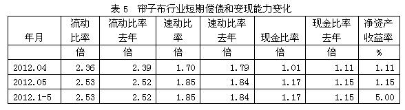 從短期償債和變現(xiàn)能力的變化看,簾子布行業(yè)流動(dòng)比率(流動(dòng)資產(chǎn)/流動(dòng)負(fù)債)2012年1-5月份為2.53倍,而上年同期為2.52倍,流動(dòng)比率較高,表明企業(yè)短期償債能力較強(qiáng);